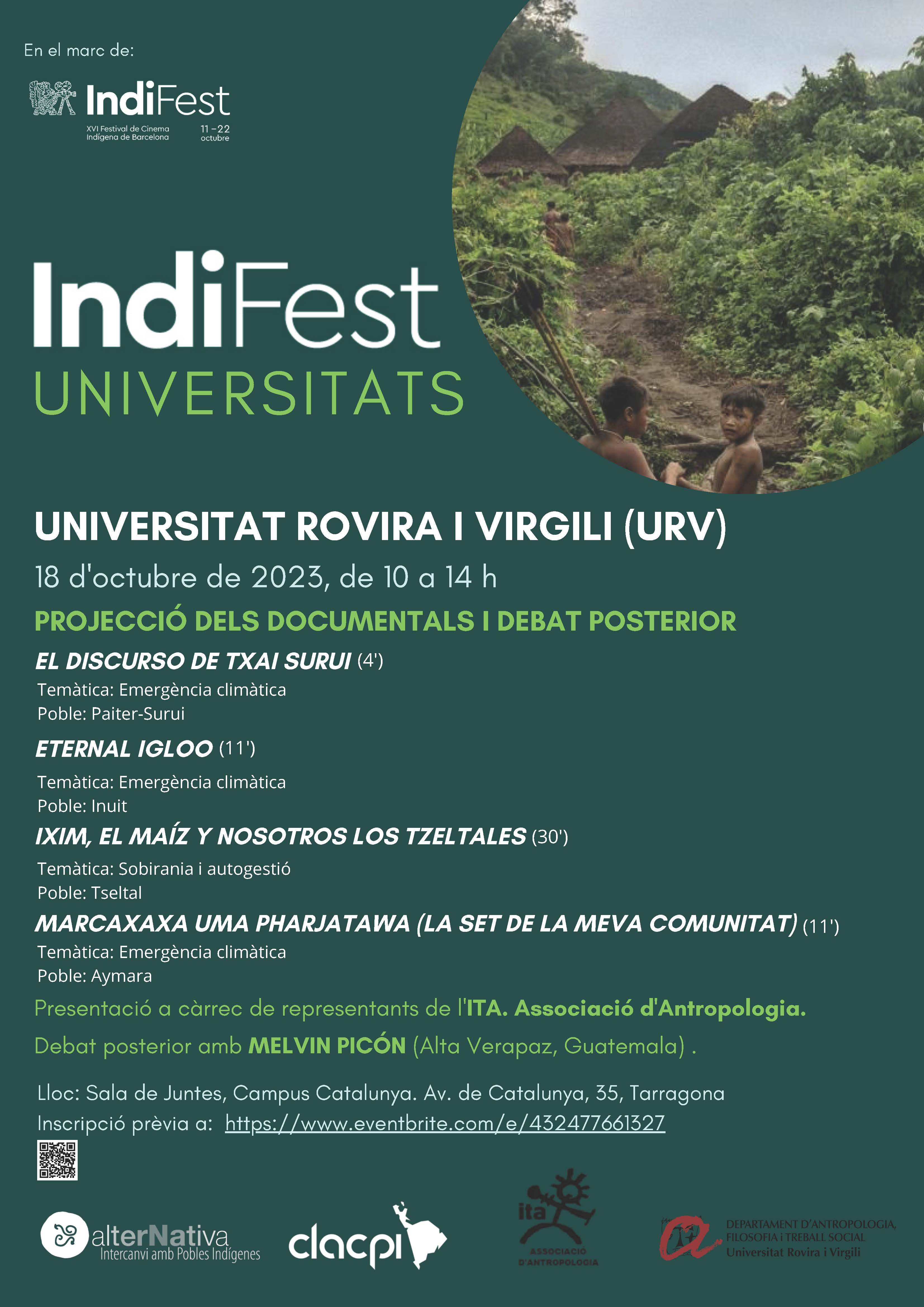 El proper 18 d'octubre celebrem a la Universitat Rovira i Virgili (Tarragona), una sessió de l’INDIFEST. Festival de Cinema Indígena de Barcelona.
