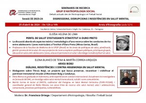 Nova activitat del Grup d'Antropologia Social (SGR), dins dels Seminaris de Recerca: debats actuals des de l'Antropologia i el Treball Social. Aquesta tercera sessió duu per títol «DIGRESSIONS, DISRUPCIONS I RESISTÈNCIES EN SALUT MENTAL»