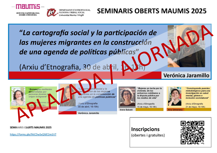 Us informem que la sessió del cicle Seminaris Oberts 2025 del MAUMIS, Conferència: "La cartografía social y la participación de las mujeres migrantes en la construcción de una agenda de políticas públicas", a càrrec de: Verónica Jaramilla, s'ha AJORNAT i es fixarà una nova data que ja us comunicarem.