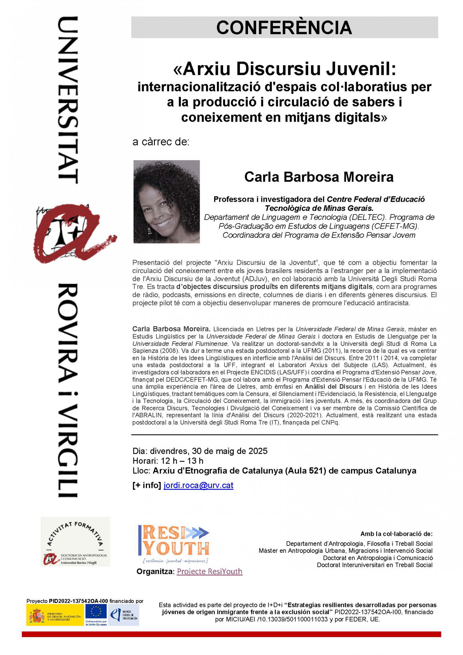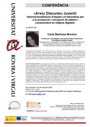 Ens complau anunciar la conferència titulada «Arxiu Discursiu Juvenil: internacionalització d'espais col·laboratius per a la producció i circulació de sabers i coneixement en mitjans digitals», a càrrec de la Dra. Carla Barbosa Moreira, professora i investigadora del Centre Federal d'Educació Tecnològica de Minas Gerais (CEFET-MG).