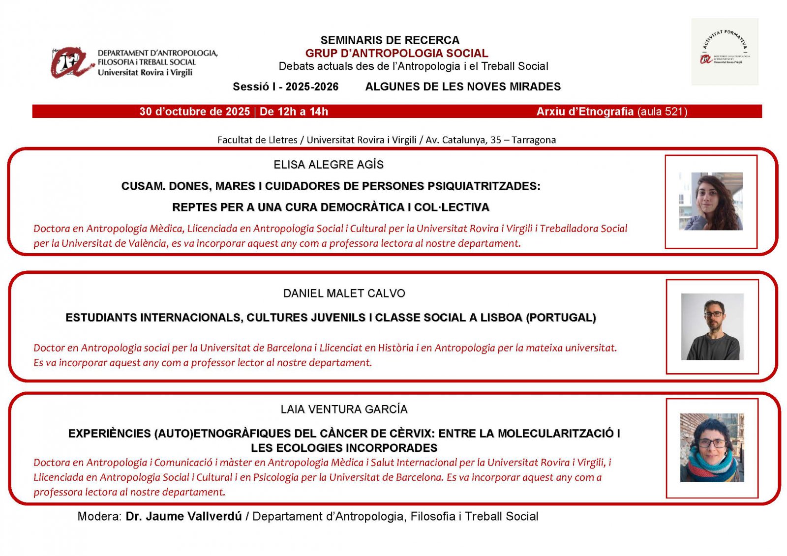 Moderador: Dr. Jaume Vallverdú, miembro del grupo de investigación y director del Departamento de Antropología, Filosofía y Trabajo Social.
